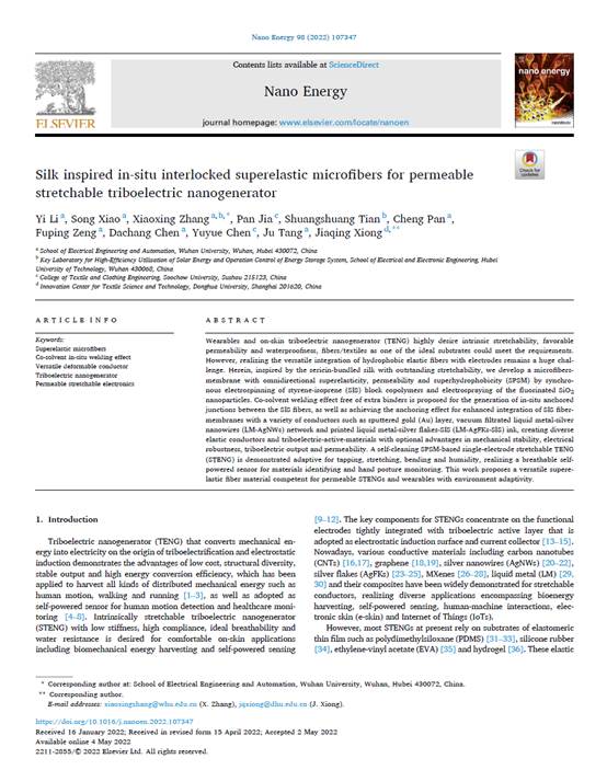 唐炬教授课题组和东华大学熊佳庆教授团队在柔性可穿戴摩擦纳米发电机的最新合作研究成果。论文题目为“Silk inspired in-situ interlocked superelastic microfibers for permeable stretchable triboelectric nanogenerator”(受蚕丝启发的原位互锁超弹性微纤维用于透气可拉伸摩擦纳米发电机)。A片直播