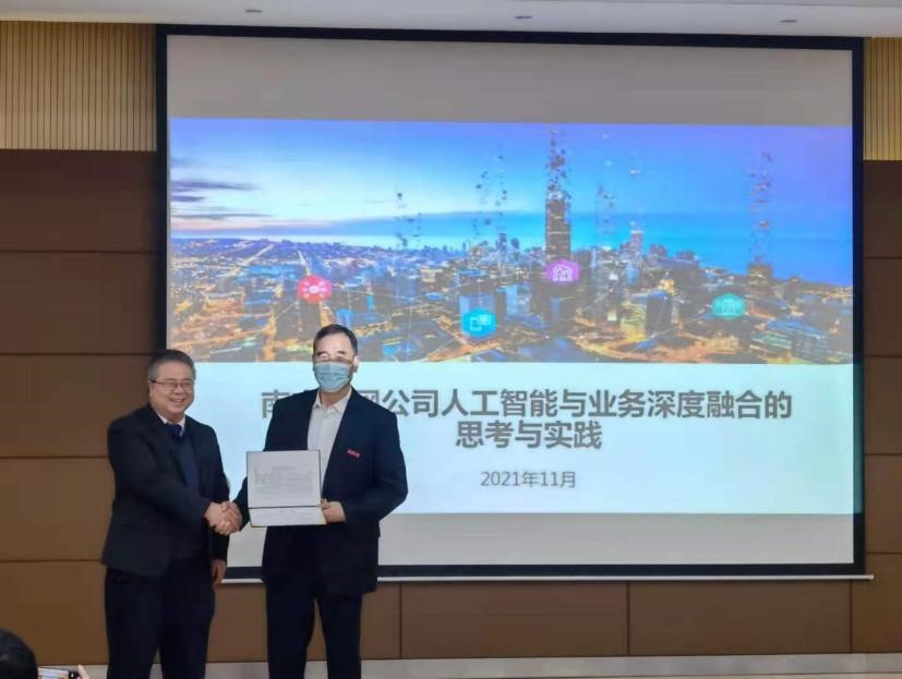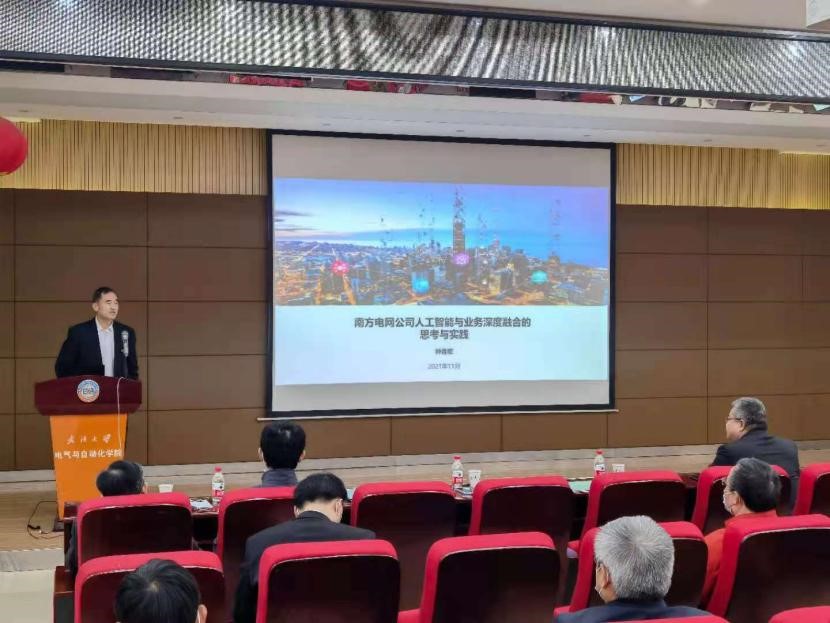 聘任仪式结束后,钟连宏教授作了题为《南方电网公司人工智能与业务深度融合的思考与实践》专题学术报告。报告介绍了南方电网公司在数字化转型过程中的发展历程,深度阐述了智能技术在智能装备、现场作业、状态监测、评价与指挥等电力生产四大领域的具体应用实例,介绍了采用人工智能技术来解决生产关系不适应生产力发展、设备增长与人员减少等矛盾,达到降低设备及人身风险、提高供电可靠性、提高劳动生产率的应用效果。