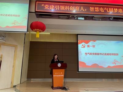 院党委副书记孟威老师致辞。孟书记首先肯定了过去一年A片直播师生在科创竞赛中取得的成绩以及学院在促进学科竞赛水平提高上的辛勤付出,并对大家提出了三点要求:一是基层教师党组织要深刻认识到学科竞赛对学生全面发展的重要作用;二是教师党员、学生党员要积极发挥模范带头作用,带头组队、带头参赛;三是制度创新,把党建与教研活动有机结合,定期开展教研活动,同时学院要为师生参赛创造良好的保障条件。