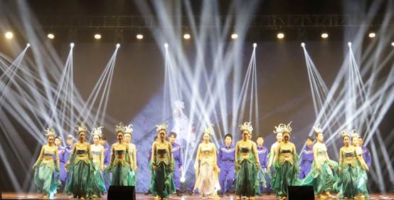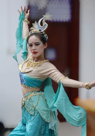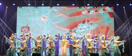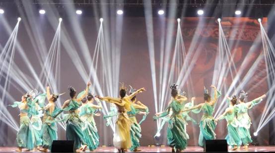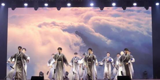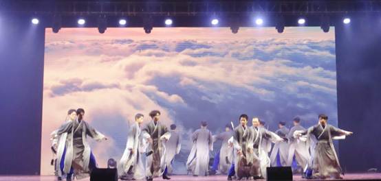 掸去千年尘埃,展开霓裳羽衣;素手把芙蓉,虚步蹑太清;霓裳曳广带,飘拂升天行。有曼妙女子,清颜彩衫,青丝墨染,裙袖漫舞,如同飞天神女把思绪引入广阔的云霄。舞蹈的开场,一曲荡人心魄的音乐轻扬而起,女生们轻舞漫步纵身起舞,便把观众带入了千年前古人的一场大梦。
