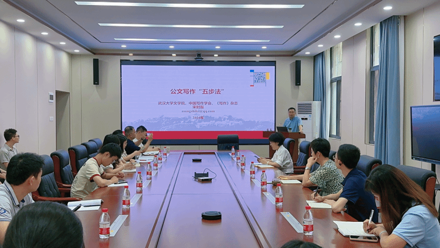 文学院《写作》杂志编辑部主任、中国写作学会副秘书长、理事宋时磊老师讲授公文写作“五步法”,副院长袁丽华主持培训会。