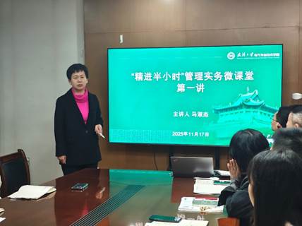 办公室党支部以党建为引领,紧密围绕党建品牌创建工作,精心策划了“点滴精进 效能跃升——精进半小时”管理实务微课堂特色活动。11月17日上午,微课堂正式开讲,学院党委书记马淑杰亲自讲授第一课。