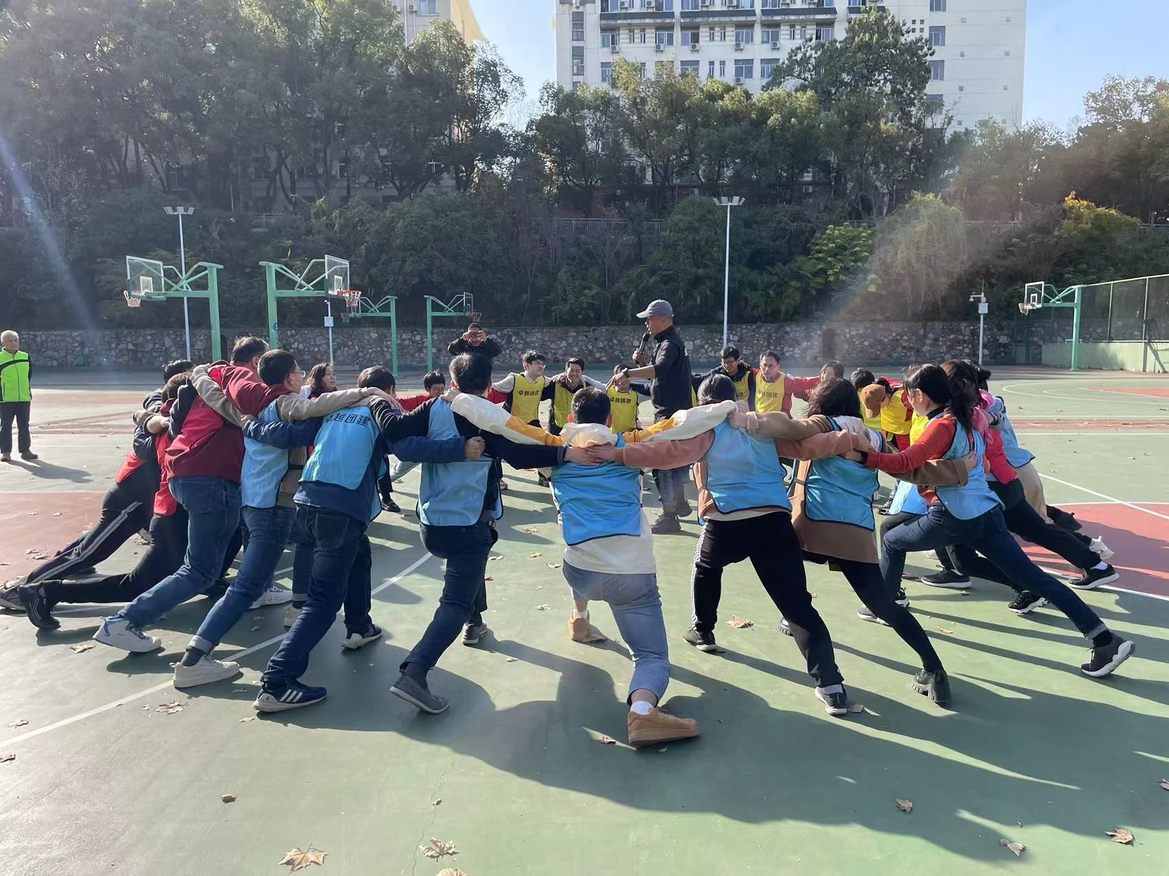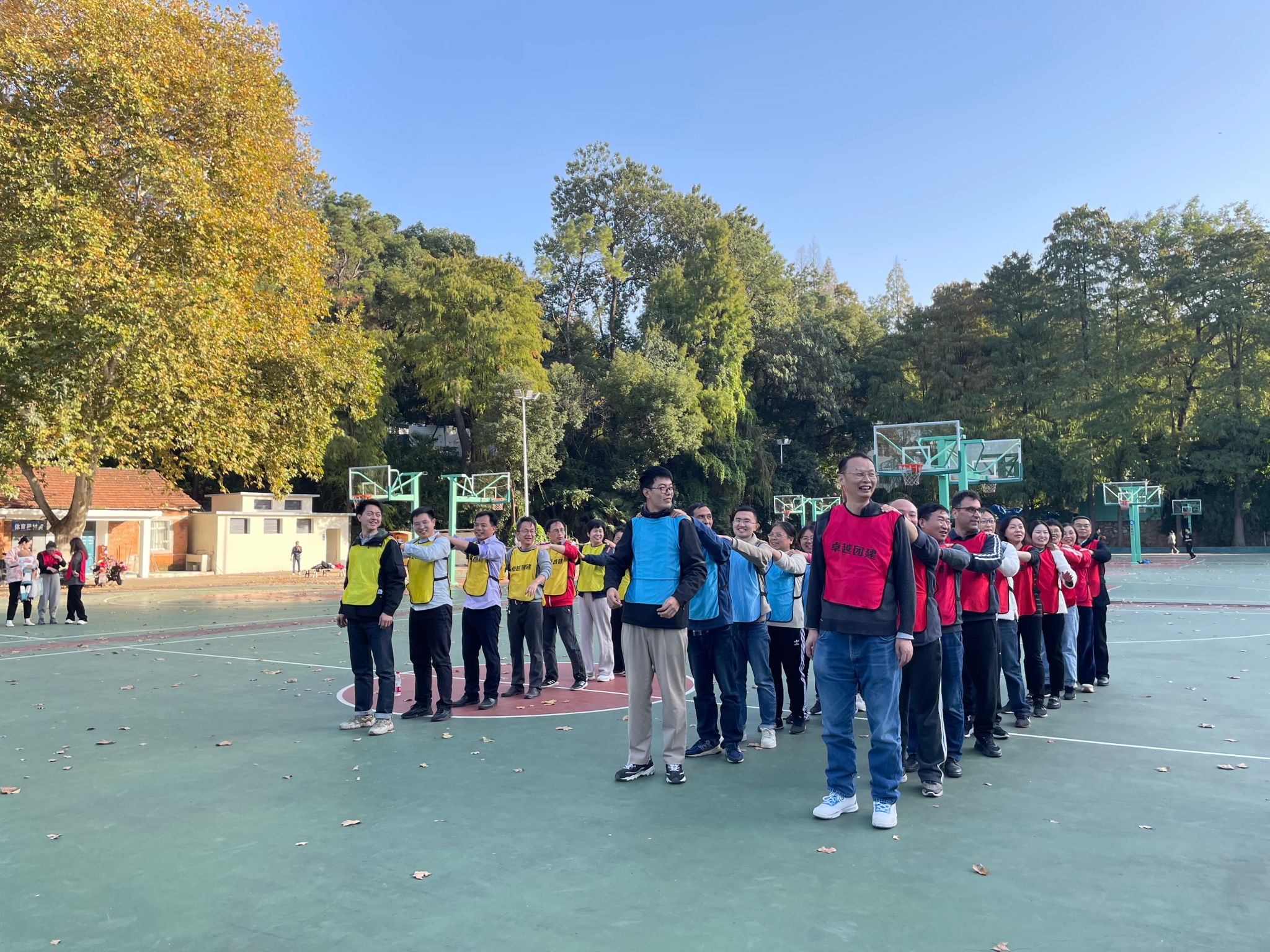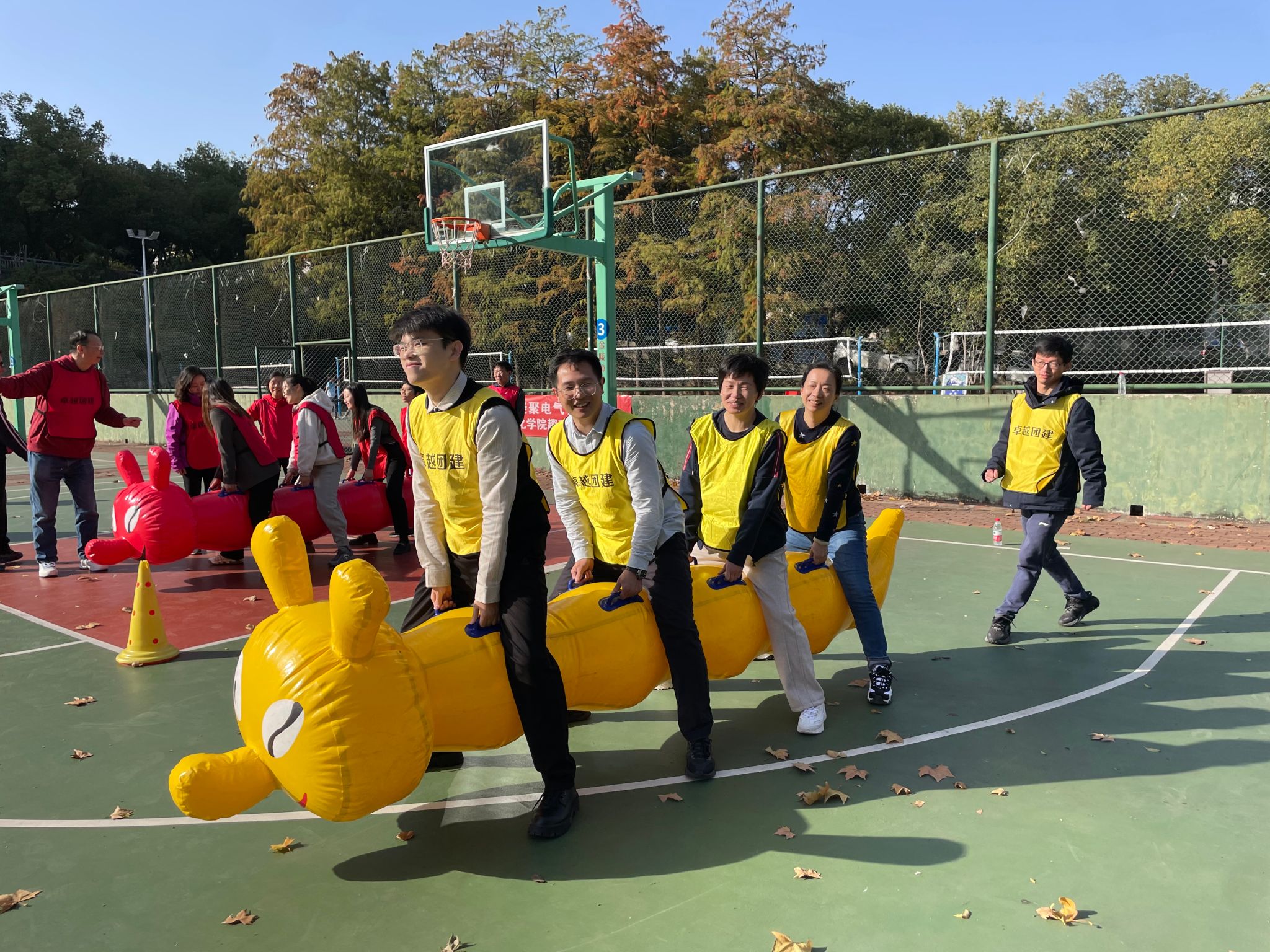 下午2点,学院党委书记马淑杰书宣布运动会正式开始! 在愉快的热身活动后,队员们分成了三个小组,穿上了“红、黄、蓝”队服,并选出了队长。