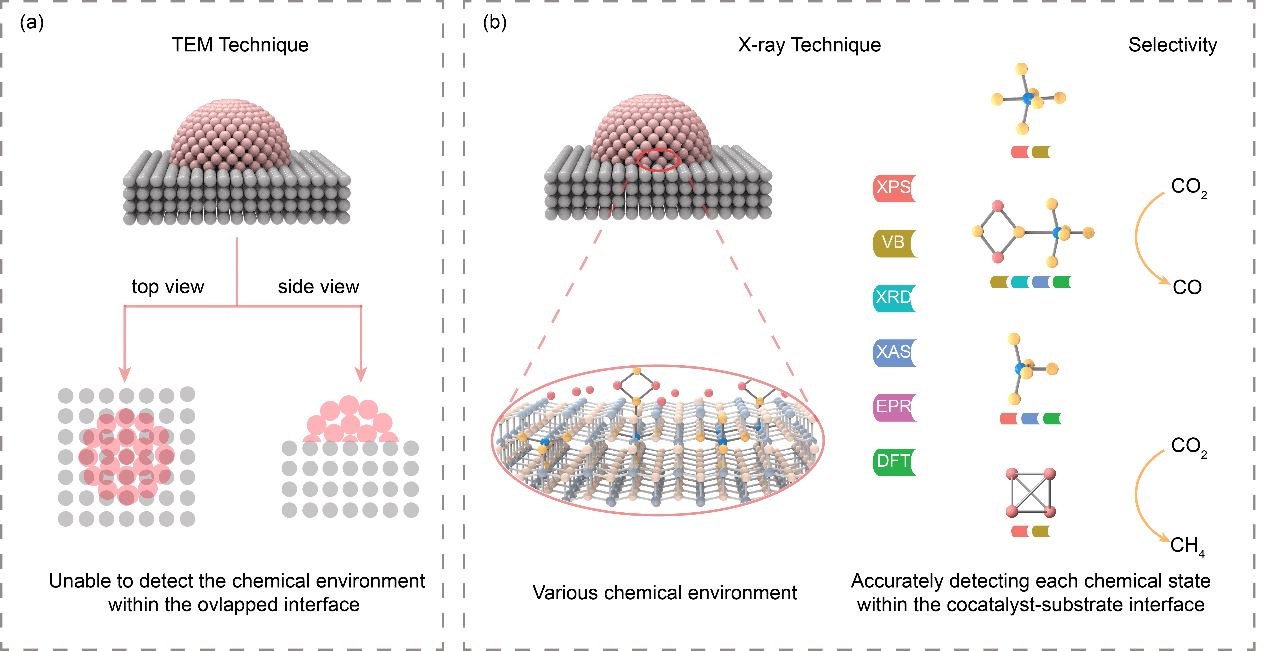人工光合作用可以将CO2转化为CH4, CO等重要燃料,是实现太阳能向化学能转化与储存的有效手段。就经济效益而言,产物单一更利于工业化应用的发展,而在人工光合作用体系中,产物的选择性往往与复合型催化剂界面处催化位点的种类与数量密切相关,因此通过特定的表征手段,探明复合型催化剂界面处的化学环境(催化位点),建立与CO2还原的构效关系至关重要。