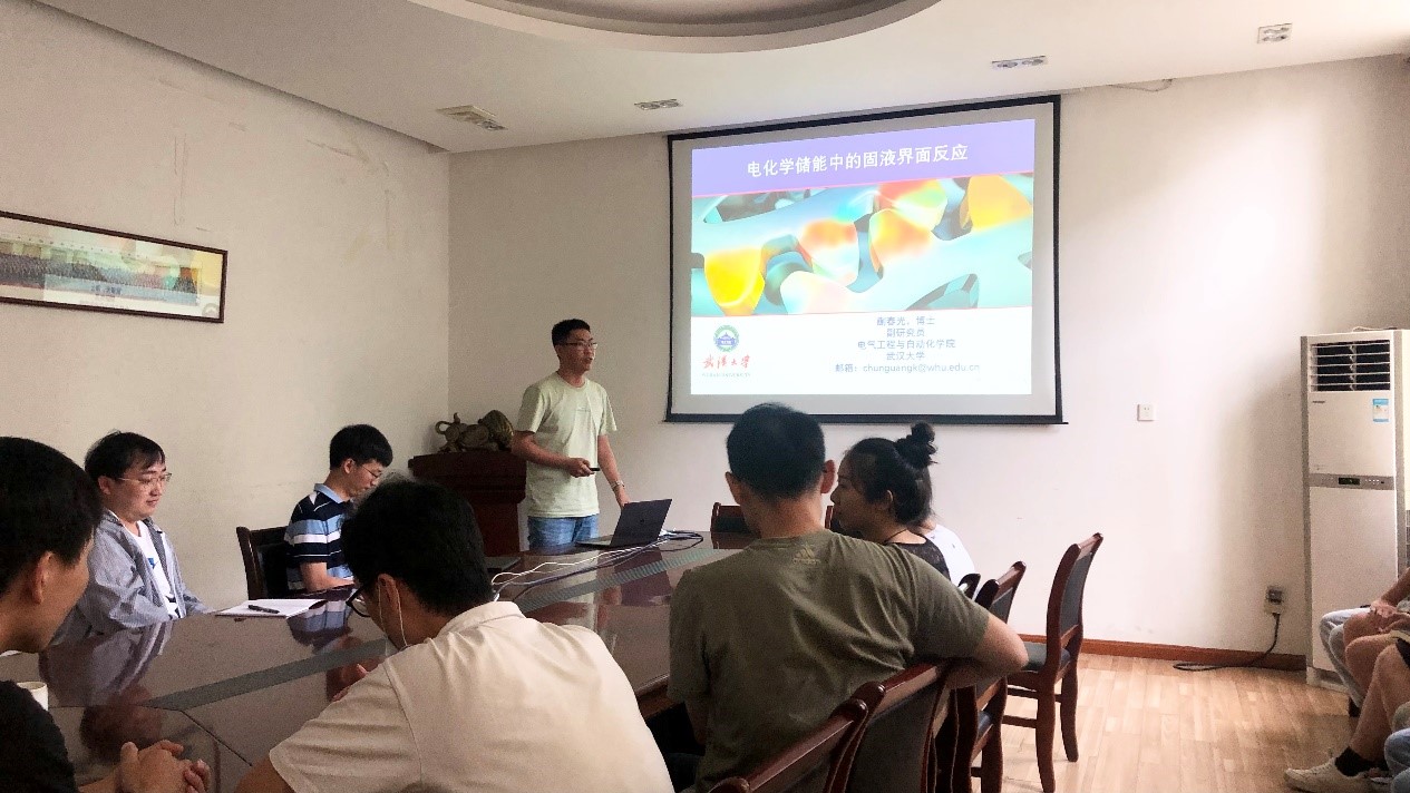 蒯春光老师以《电化学储能中的固液界面结构》为题进行学术分享,固液界面结构是影响电化学储能系统,如锂离子电池、电化学分解水电解池的性能和稳定性的关键因素。探究电化学过程中固液界面的结构对于理解能量存储与转换过程非常重要,而且充满挑战。蒯春光老师以电催化产氧反应为例,阐述了Ni-Fe氢氧化物片层催化剂在固-液界面在反应过程中的变化规律,为高效稳定的电化学产氧催化剂的设计提供了理论依据。考虑到相变失活通常关注结构变化,而很少考虑元素偏析的问题,通过研究可逆的相变为OER催化剂的复活提供了新方法。分享结束后同学们根据电化学储能和燃料电池相关研究,从不同应用场景下对析氧反应的促进和抑制方法进行提问,目前可以通过电极材料表面镀层,水分子包覆、点位调整等方法实现对析氧反应的调控。与会教师从检测手段出发,提出研究中心检测方法使用的连续的X射线对镍铁氢氧化物催化剂的损伤程度相关问题。