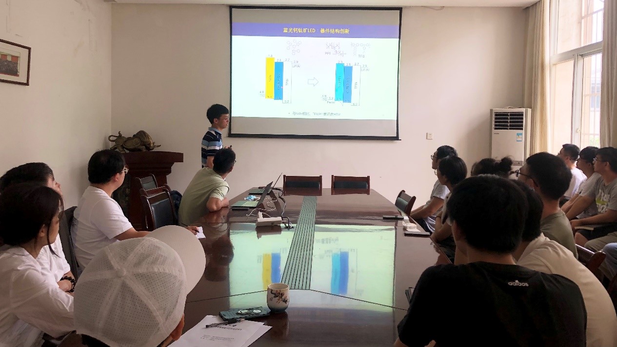 侯绍聪教授以《新型光电能量转换材料与器件》为题进行学术分享。在晶体硅光伏电池大规模应用的背景下,全球也在竞相研发包括新形态和新机制在内的新型光伏电池,以追求更低成本、更高效的光伏发电。在能量消耗端,高效的光源(电变光)有助于减少二氧化碳排放。照明和显示等领域的迫切需求也驱动光源技术以更快速度的迭代,其中重要的方向是基于新材料和新原理的光源技术。基于此,侯绍聪教授分享了钙钛矿在光电领域的前沿发展和研究,在场的学生踊跃发言,对器件阵列对整体性能的提升、器件阵列现阶段存在的制造工艺方面的短板进行提问。侯绍聪教授根据同学提问进一步抛出问题“为什么说一个好的太阳能电池就是一个好的LED”,并从机理层面进行了细致分析。与会教师结合科研需求,向分享人进一步了解激光光源波段选择,输出光能能量的范围等详细情况。