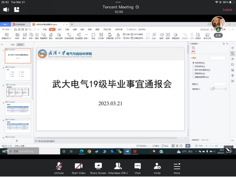 本科2019级线上召开了本年度第三次年级大会并邀请全体同学家长参加。辅导员赵薇老师出席大会,学生会主席庞轩佩同学主持会议并介绍毕业情况相关事宜,学生会秘书长张丽颖同学介绍学分审核情况。