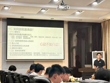 大会第二项,由青年教师和学长学姐进行经验分享。由侯绍聪教授、陈剑飞教授、黄怡鋆博士及彭长志博士分享他们的留学经历。