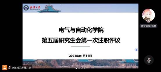 第五届研究生会第一次述职评议大会于2024年1月11日晚上8点在线上举行。学院党委书记孟威老师,研究生辅导员彭思成老师、邹春航老师,学院团委副书记刘乳燕老师,研究生兼职辅导员苏大智老师、刘运鑫老师,研会全体工作人员,部分研代会代表以及非研会同学代表参加了本次会议。