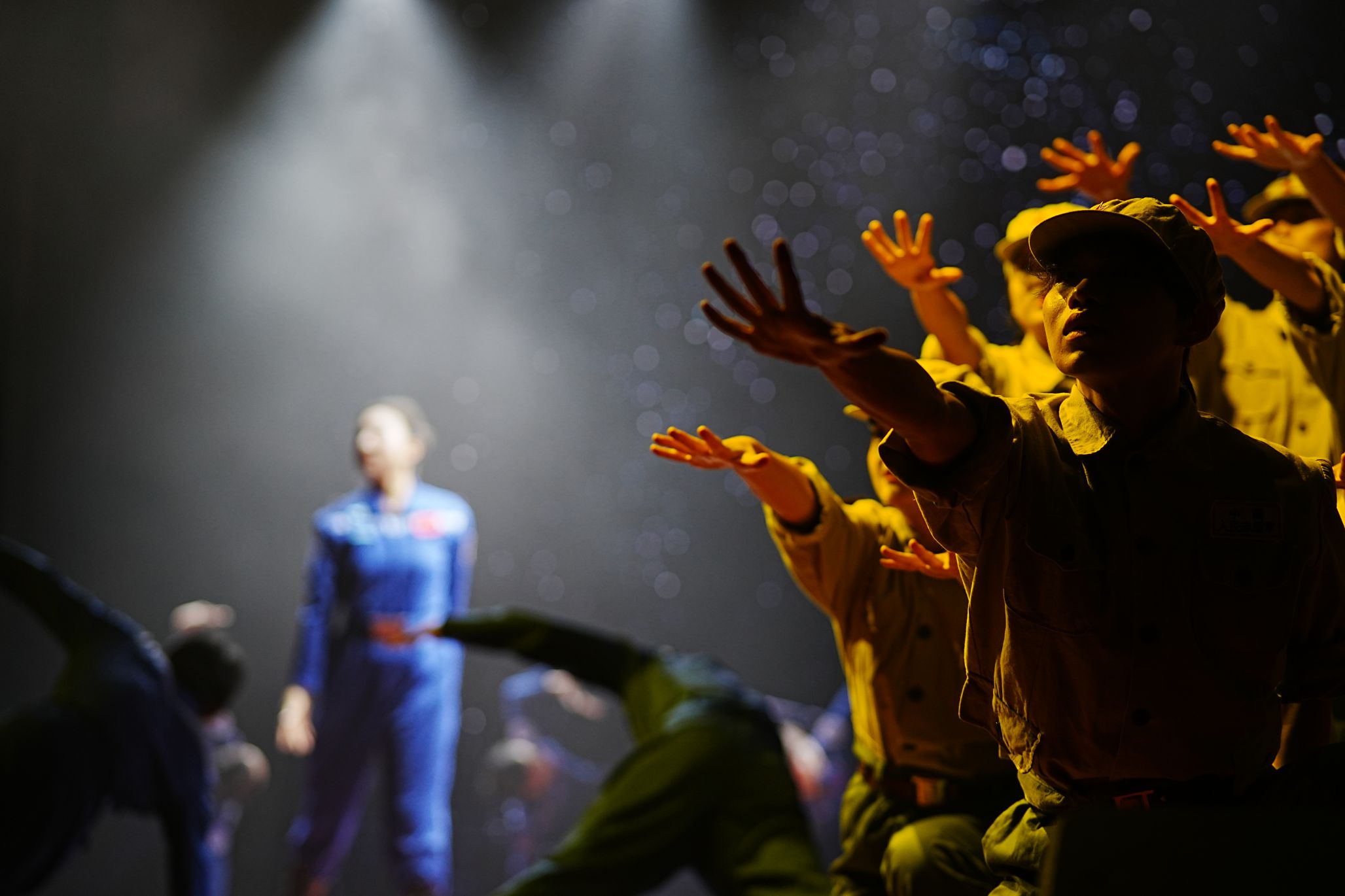 舞蹈深情地描绘了两代航天人接力奋斗的壮丽画卷,那是老与新在时间长河中的一次深情握手,是智慧与勇气在岁月里的璀璨交响。在研究初期,科研人员与军人的面色凝重深沉,此时的舞蹈,节奏紧张急促,仿佛科研人员心中的脉搏,随着研究的深入与实验的推进而加速跳动。当那颗承载着无数科研人员心血与梦想的卫星终于成功发射,划破天际,绽放出璀璨的光芒时,科研人员与军人们的脸上露出了难以抑制的喜悦与自豪。表演的情绪层层递进,让看者仿佛身临那个风云际会的年代,参与那场只争朝夕的事业,体会无数艰难险阻之后的成功的喜悦。