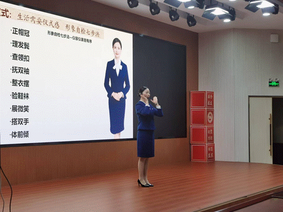 接下来,桂静平老师对礼仪的实践部分进行了讲解,声情并茂地与大家进行礼仪演示与互动。首先教大家形象自检七步法——仪容仪表皆有序,各位老师与同学们都积极参与,起身学习。接着桂静平老师又详细讲解了着装规范礼仪、体态礼仪等,干货满满,为同学们未来的日常生活与职业道路都提供了宝贵的礼仪知识。