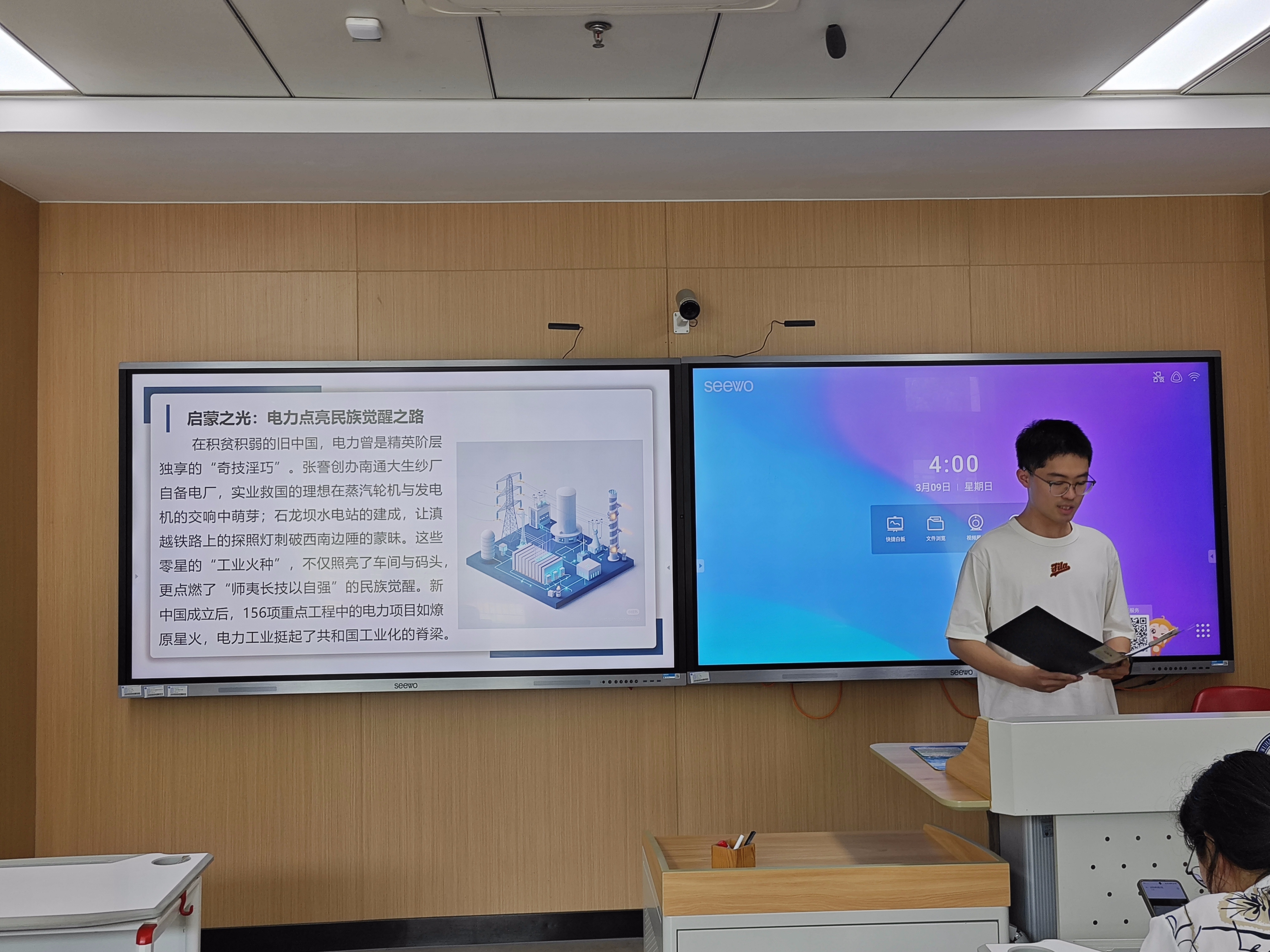 “我与电的故事”创意演讲比赛现场精彩纷呈,同学们围绕电气老物件、电力人物故事等与“电”相关的内容各展风采。有的同学深情讲述家中老旧电器的故事,在娓娓道来中勾起大家对往昔生活的温馨回忆;有的同学则兴奋分享自己与电力行业先进人物的交流经历,以情景剧、多人演讲、脱口秀等新颖独特的形式,充分展现了当代电气青年的青春活力与创新精神。