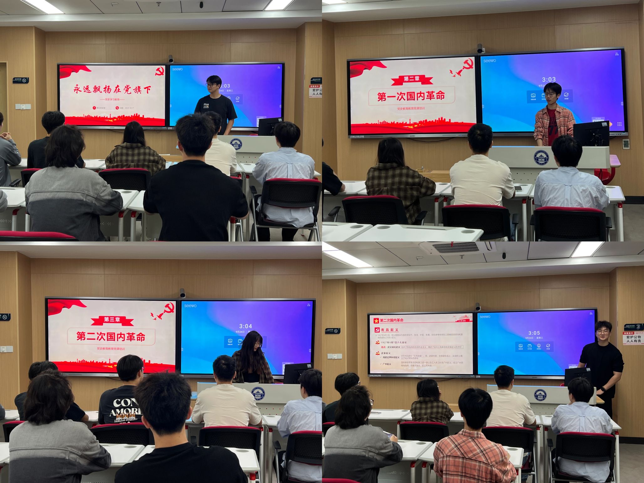 随后,支部在教室开展了“党员微讲堂”活动。六名党员代表围绕《永远飘扬在党旗下》学习资料,分别就不同历史时期党的奋斗历程进行了深入浅出的讲解。从建党的开天辟地,到新中国成立的改天换地,再到改革开放的翻天覆地,最后到新时代的历史性成就,讲解内容系统全面、重点突出。在交流环节,同志们踊跃发言,现场气氛热烈,通过思想碰撞深化了对党史的理解和认识。
