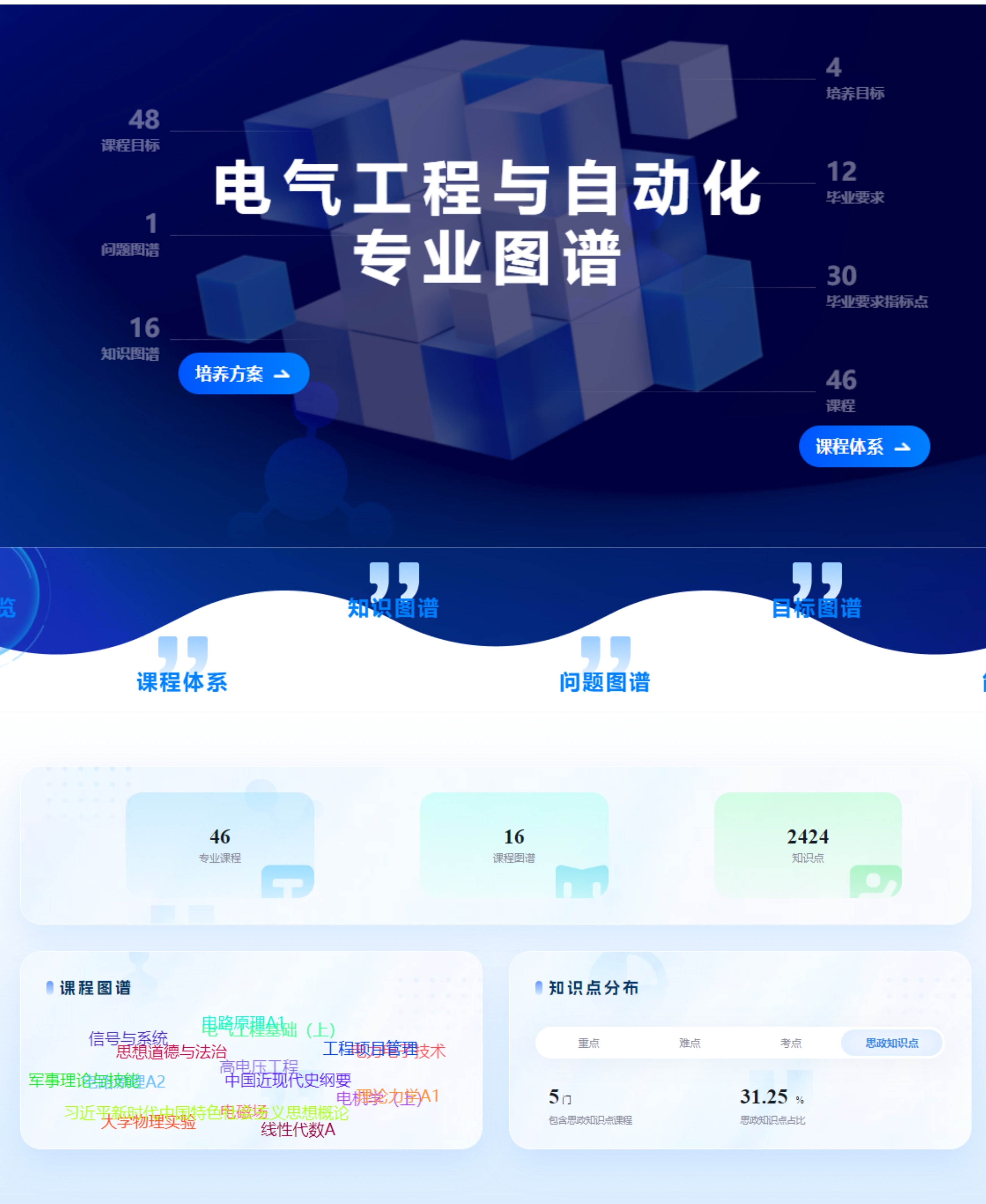 作为学校首批专业知识图谱建设试点,学院以电气工程及其自动化专业为先行,率先建设了13门专业核心课程知识图谱。学院组织专班论证并实施基于专业知识图谱的“教-学-管-评”一体化平台,整合教育资源、优化教学流程、提升管理效率,通过知识图谱全面描绘学生的知识能力、技术能力和素质能力,实施对师生个体、群体及专业的全流程质量监督,为教学管理者提供科学依据,制定更有效的教学策略与措施,推动教育教学智能化、个性化和高效化。