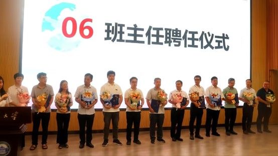 师生见面会最后一个环节是班主任聘任仪式及各班学生代表敬献鲜花并合影留念。党委书记马淑杰和院长董旭柱一起为各班班主任颁发聘书。时值教师节,各班学生代表和班主任助理也为到场的所有领导老师们献上精心准备的鲜花来表达祝福和感谢。