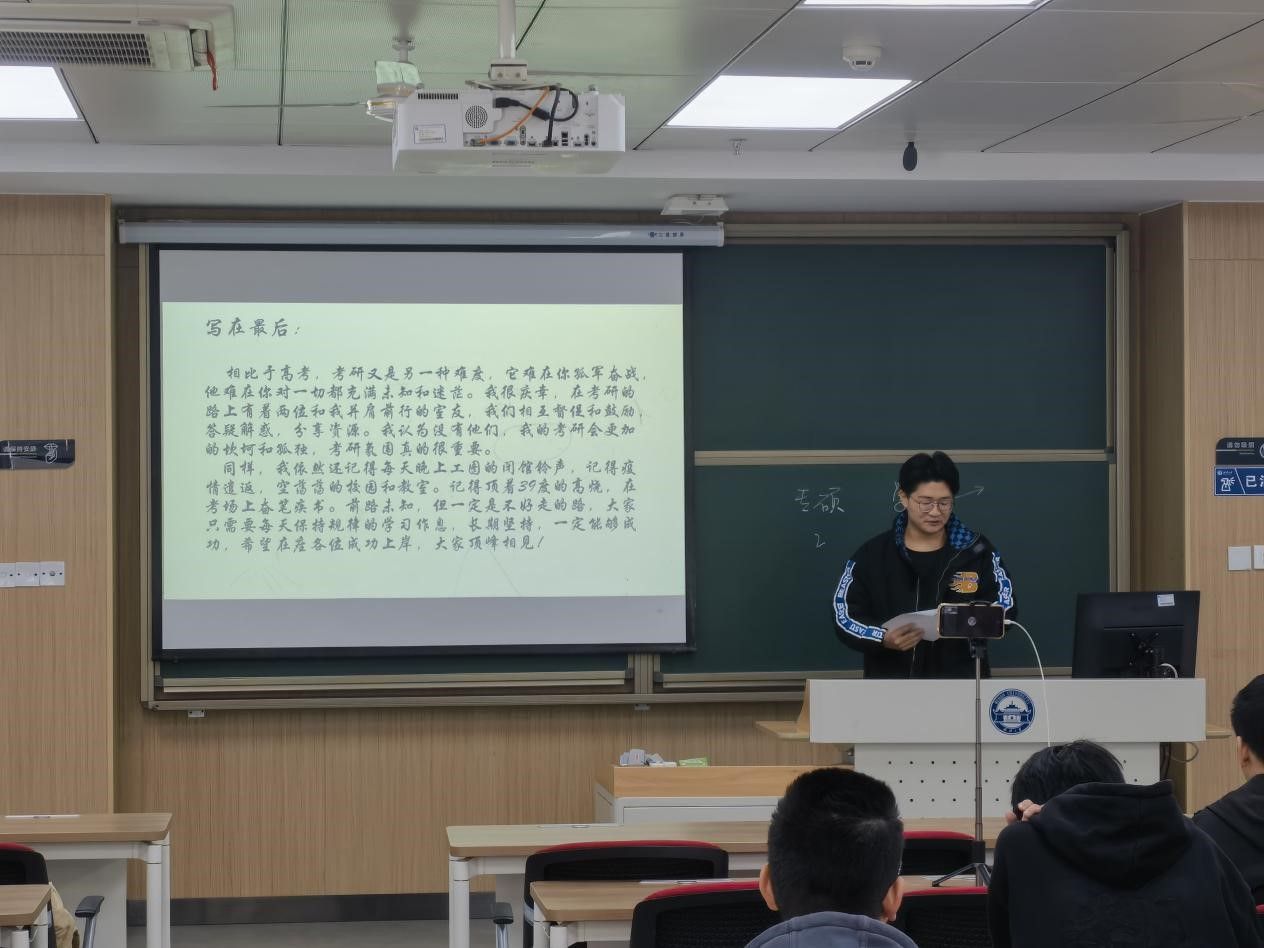 的招录情况、初试和复试科目为例子,详细介绍了考研择校的技巧——一定要了解目标院校学硕、专硕的考试科目、考试范围以及成功难度(专业课、报录比等方面)。吴泽梁以自己考研冲刺、上岸本校的经历为参考,分享了考研准备的开始时间、每个科目所用的教材和练习题以及复习的步骤。最后,他向同学们分享了自己的心得体会,鼓励同学们迎难而上,并送上了自己的祝福。