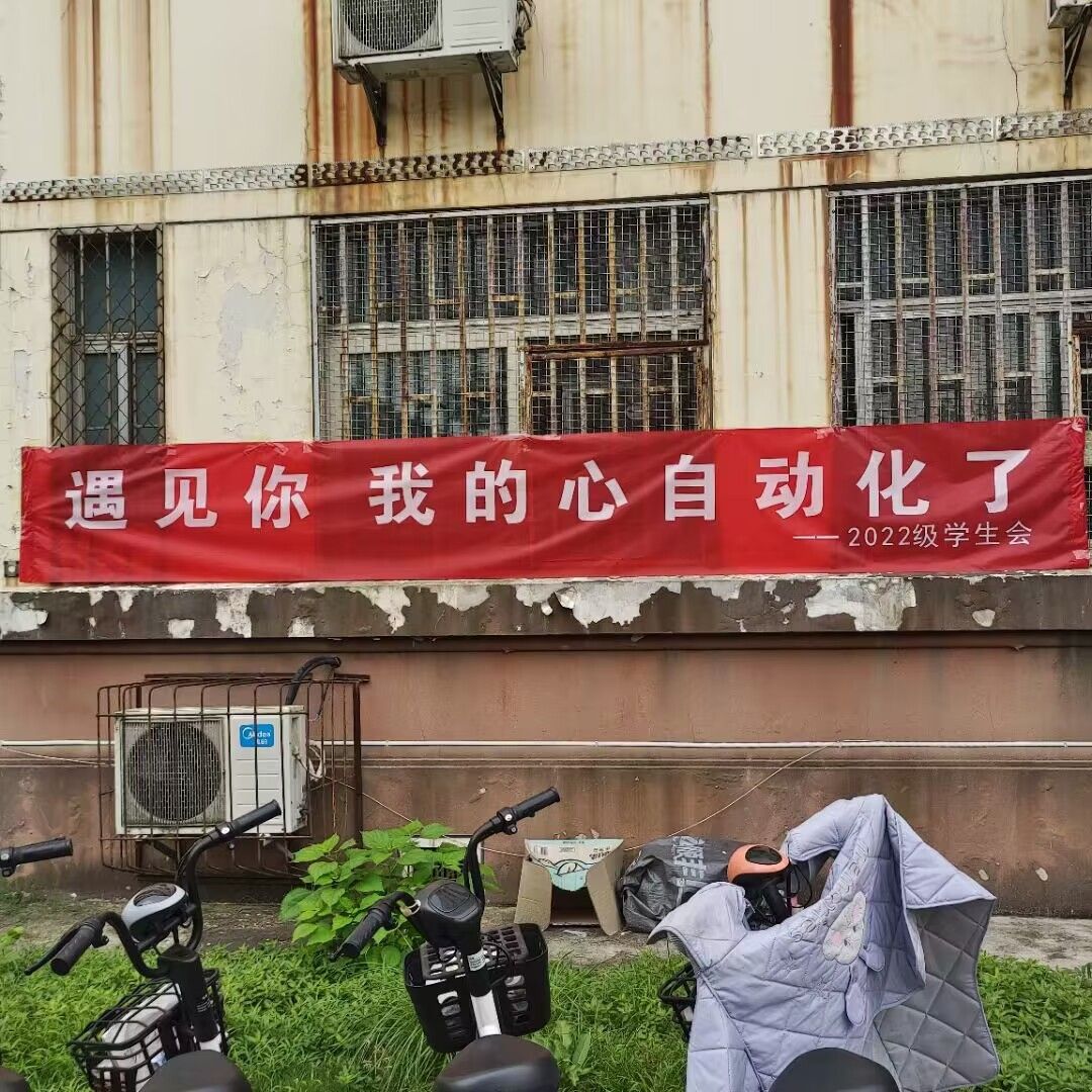 在学院的组织下,“遇见你我的心自动化了”、“记得改外卖地址”、“青春无悔在电气”——映入眼帘的是2022级团总支学生会为同学们准备的暖心的横幅。