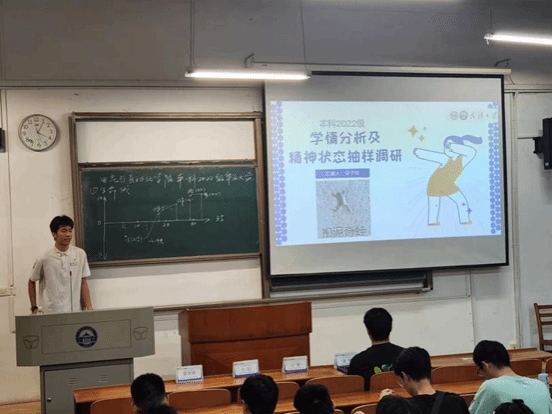 会议的第一项,学院学生会主席团成员安子岳做了电气2022级学期分析及同学精神状态报告。安子岳同学结合自己以及身边同学们考试周的学习情况通过幽默诙谐的语言展现了不同同学们考试周的精神状态,帮助同学们放下焦虑,踏踏实实走好现在的每一步。