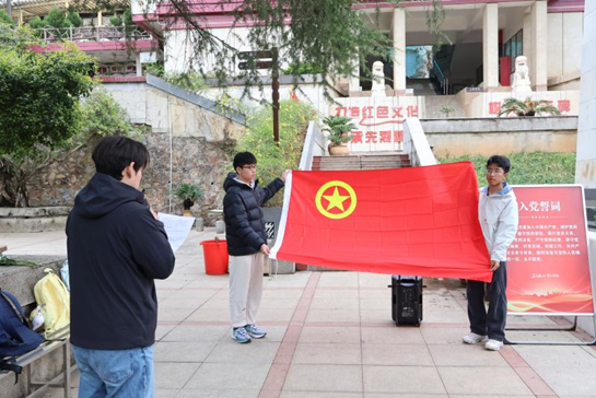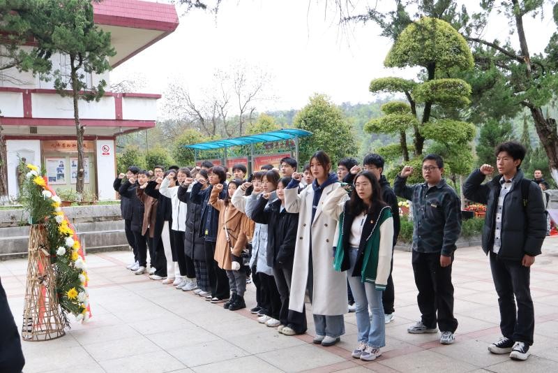 之后,领誓人崔奕新同学诵读入团誓词,全体团员右手握拳举至耳侧,齐声复诵,宣誓声与山间风声回响交织。完成既定流程后,队伍有序转入纪念馆参观。