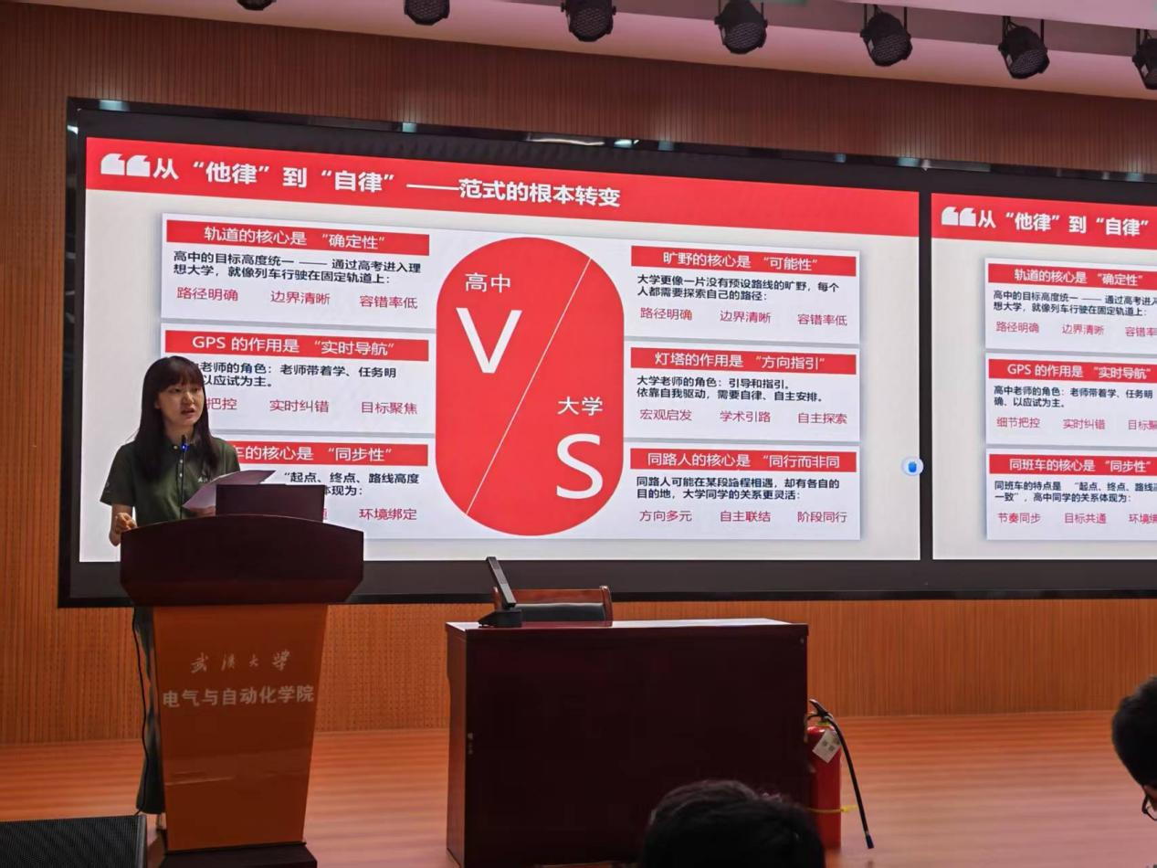 陈依鸣老师为大学新生系统梳理了大学四年的阶段性任务与发展重点。大一作为“扎根探索期”,核心是快速适配电气学科的学习节奏——无论是参与学科讲座、投身社团活动,还是承担学生工作,都是拓宽视野、夯实基础的关键。步入大二“深耕定位期”,则需聚焦专业知识的精进。主动参与学科竞赛、争取企业实习机会、加入科研启蒙项目,不仅能在实践中锤炼专业能力,更能帮助明确个人发展方向。到了大三“拔节突破期”,深化学术研究能力成为重点。此时需结合自身优势,确定保研、考研、留学或就业的目标,并展开针对性准备。大四“沉淀启航期”,要高质量完成毕业设计,实现从校园到职场的顺畅过渡,始终铭记珞珈精神与电气人的使命担当。此外,陈老师特别强调,学业是大学生活的核心,学分获取直接关系到毕业与学位资格,每一位同学都应以严肃认真的态度对待课程学习。她还结合典型违纪案例解读校纪校规,提醒大家严守纪律底线,避免因疏忽影响学业与未来发展。