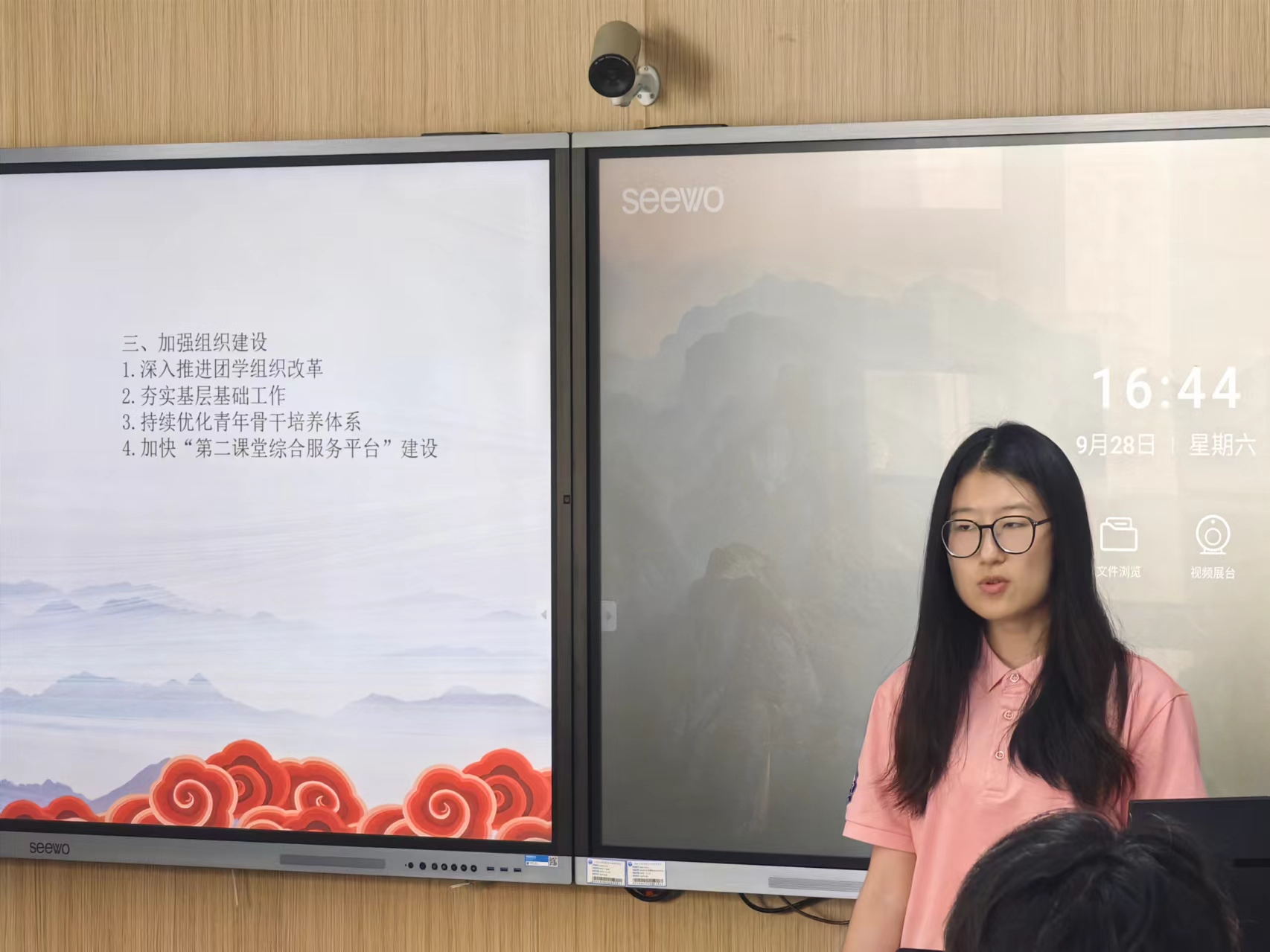 接着,由团委副书记(学生)陈箫扬报告2024下半年共青团重点的工作部署。报告由“深化思想引领”、“服务青年成长”、“加强组织建设”三个方面构成,广泛涵盖了共青团各方面工作职能。工作报告结束后,由团委委员们对报告提及的工作重点进行讨论。