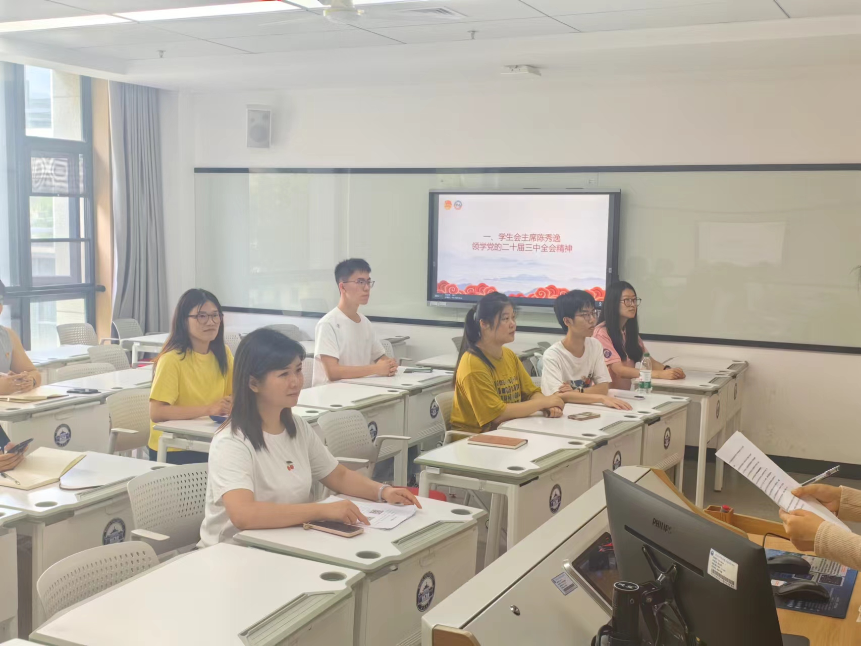 会议第一项,由学院学生会执行主席陈秀逸主持开展“新中国75华诞,党的二十届三中全会精神领航”理论学习。陈秀逸同学从党的二十届三中全会精神入手,提出青年群体应当坚定文化自信,抓好党的创新理论武装,紧密团结在以习近平同志为核心的党中央周围,为推进中华民族伟大复兴而努力奋斗。
