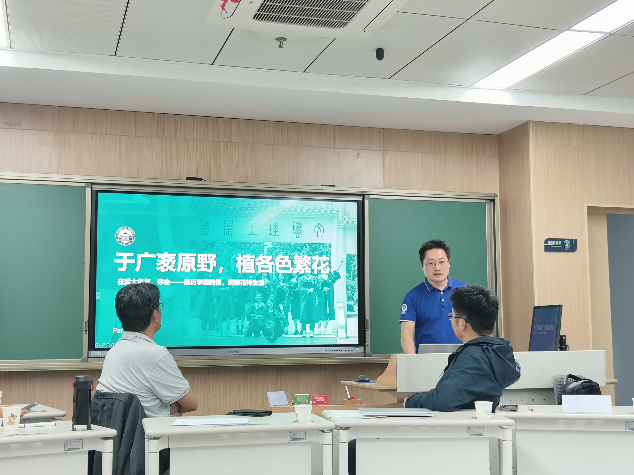 活动在有趣的自我介绍中拉开序幕。周蜜教授带来了“探索大学生活”的主题分享,他回顾自己的大学求学时光,展示了科研工作人员的“一日timetable”列表,建议同学们每天都要做好规划和记录,踏踏实实过好每一天。秦亮副教授分享主题为“于广袤原野·植各色繁华”,他通过展示实验室同学们丰富多彩的科研、学习、学生工作和课外活动,鼓励大家敢于提问和尝试去拓宽生活半径,积极探索适合自己的成长规划。