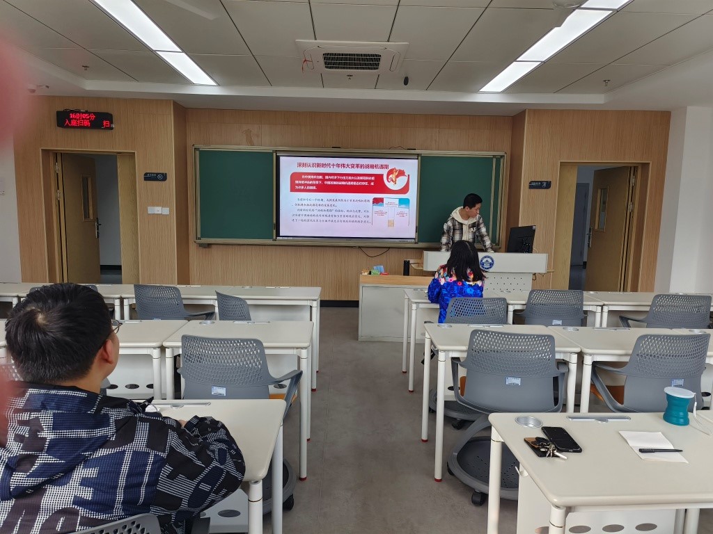 班会上,同学们认真听讲,积极学习我国防疫精神,二十大新思想。