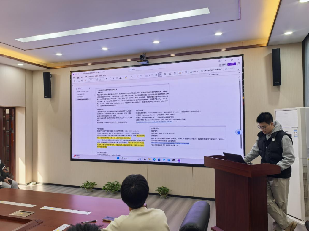 12月6日,美国数学竞赛(简称美赛)分享会在第四会议室成功举行。本次分享会由田志瞳和张明鑫两位优秀学长担任主讲嘉宾,白不工同学主持,吸引了众多对数学竞赛感兴趣的同学参与,为大家深入了解美赛提供了宝贵机会。