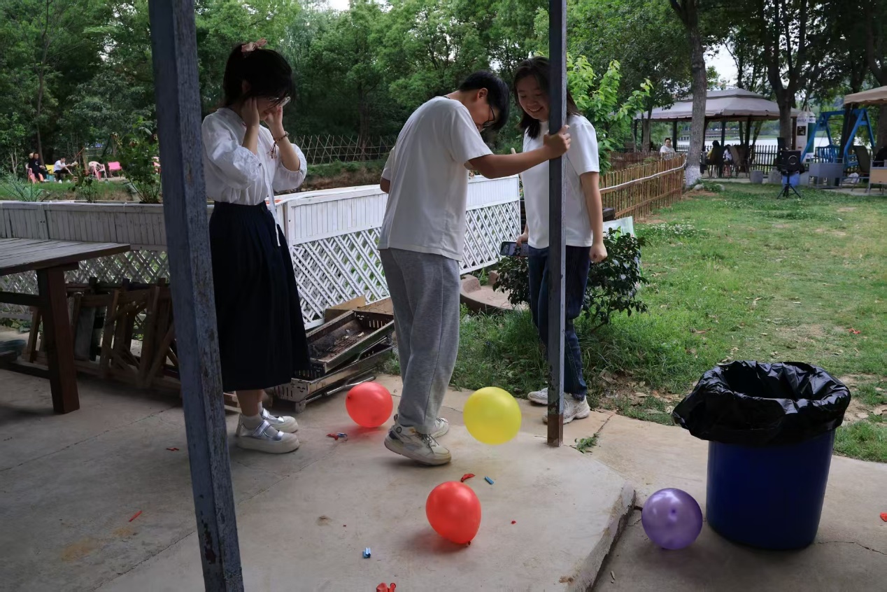 不同于其他心理班会的举办,这次活动没有直接切入主题,而是以一场充满烟火气的方式开场。活动当天,同学们井然有序地进行了烧烤准备,现场气氛逐渐升温。随后,心理班会活动正式开始。第一个环节是“压力气球”游戏,同学们将自己在学习生活中遇到的压力或困难写在便签上,贴在气球上并吹大,最后放在地上踩爆。在一阵阵爆炸声中,同学们仿佛向压力打响了第一枪,释放了内心的压抑情绪。