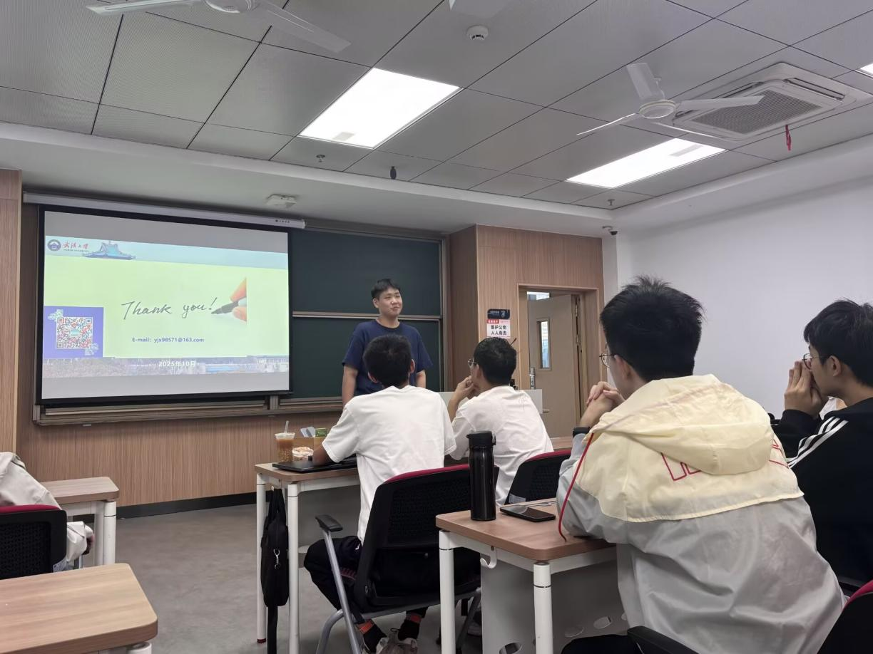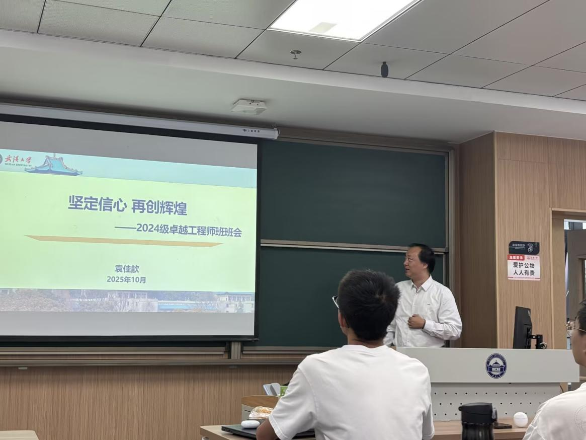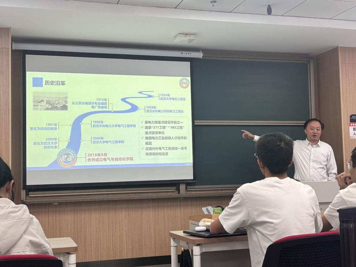 深厚人文底蕴与卓越工科追求交融下的发展历程。老师梳理了电气学科的建设脉络,指出了学院在面向国家重大战略需求、发展前沿电气与自动化技术过程中所形成的重要地位。他还结合近年为回应社会对高端工程技术人才的迫切需求,学院在招生培养模式上的优化与调整,让同学们对卓工班的设立背景和未来发展机遇有了清晰认知。紧接着,老师聚焦于学院的雄厚学科实力,介绍了多个支撑科研创新的高水平实验室与研究中心,并特别强调了学院在新能源电力系统、先进控制理论与应用等前沿领域取得的显著成果。这番介绍极大地增强了同学们作为“武大电气人”的专业自豪感与使命感。随后,老师还结合自身的学习、求职经历及科研趣事,以亲切的师者视角,拉近了与同学们的距离。