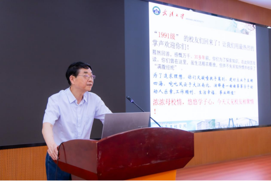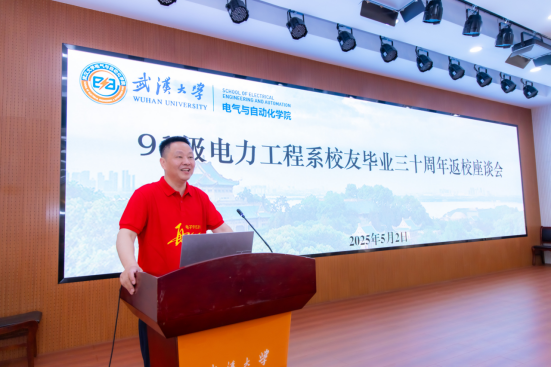 查晓明教授随后发言,他表示,尽管学院的建筑布局、学科名称历经变迁,但每一位校友回到这里,依然能在一砖一瓦、一草一木中找到青春的印记——因为这里不仅是知识的摇篮,更承载着无数人关于成长、梦想与奋斗的独家记忆。“武大电气的发展,离不开每一位校友的支持。”他谈到:“电气学科始终与国家发展同频共振,一代代学子从珞珈出发,在电力行业的各个岗位扎根深耕,成为支撑国家能源事业的骨干力量。”号召大家共同助力学院建设,“让我们携手培育更肥沃的‘电气土壤’,为国家输送更多‘底色亮、基础实、能力强’的拔尖人才。” 他的话语既饱含对学科使命的深刻认知,又充满对校友的温情召唤,引发在场校友的强烈共鸣。